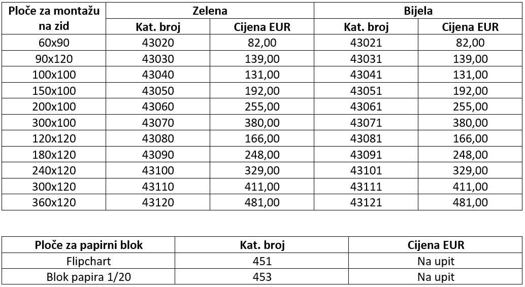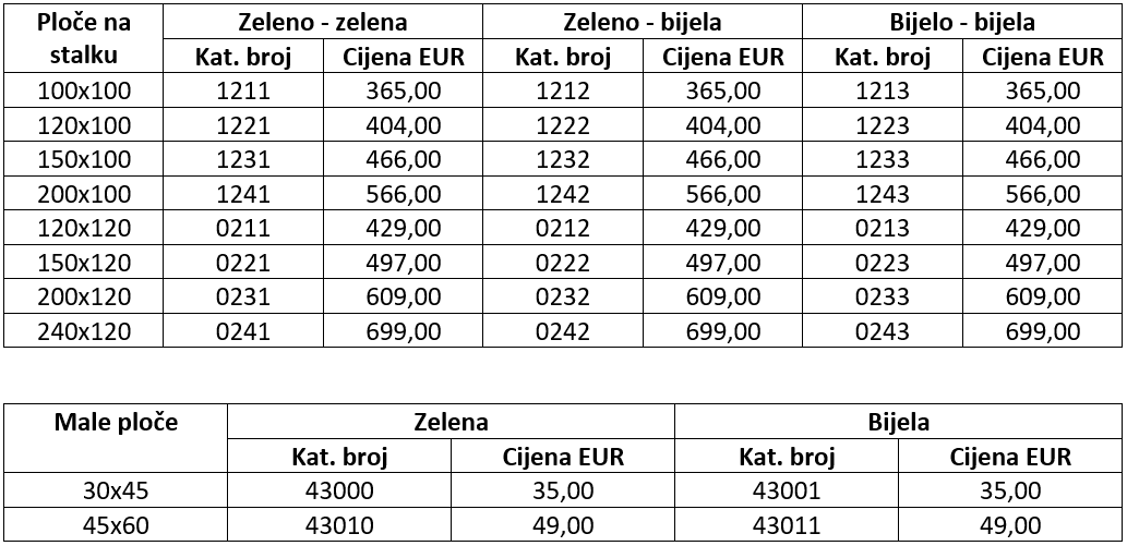 Čvrsti stalci su izrađeni od željeznih profila i plastificirani. Kombinacije zelene i bijele boje za pisanje i veliki izbor veličina